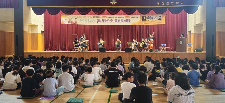 [시흥시 세계타임즈=송민수 기자] 냉정초등학교는 지난 6월 27일 찾아가는 오케스트라 공연을 개최하여 학생들에게 큰 환호를 받았다. 이 특별한 행사는 학교의 문화예술교육 프로그램의 일환으로, 학생들에게 음악의 감동과 예술의 아름다움을 경험하는 기회를 제공하기 위해 마련되었다.