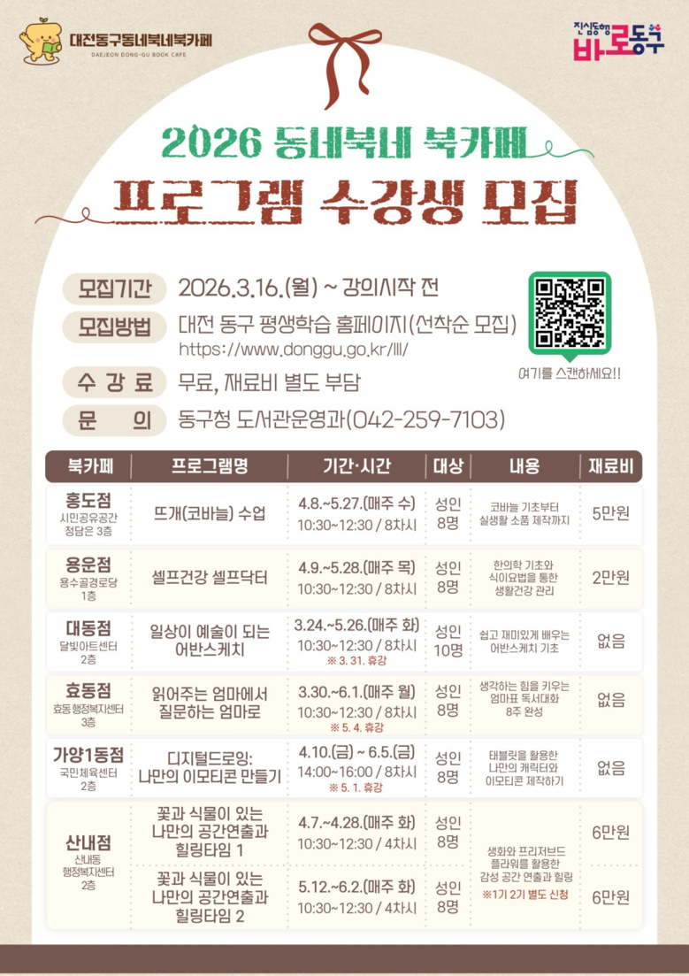 한편, 기타 프로그램 관련 자세한 사항은 동구 평생학습 홈페이지를 참고하거나 동구 도서관운영과 도서관정책팀(☎042-259-7103)으로 문의하면 된다.