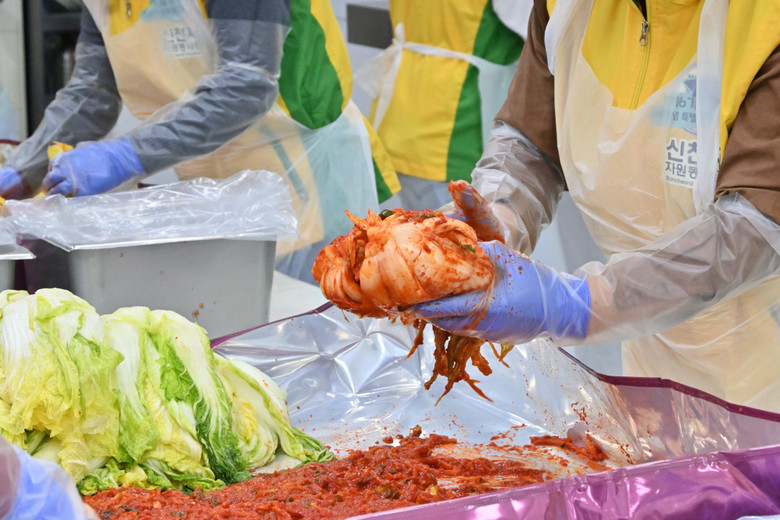 | ▲ 지난달 29일 제 1회 수료기념 특별봉사 ‘첫걸음’에 참여한 수료생이 절임 배추에 소를 묻히며 김장하고 있다. [사진 제공 = 신천지 바돌로매지파 영등포교회] |