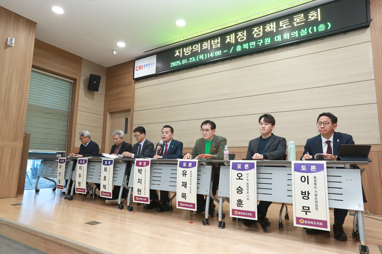 토론회는 박지헌 의원(청주4)이 좌장을 맡아 유재목 부의장(옥천1), 최호택 배재대 교수, 하민철 청주대 교수, 이두영 충북경제사회연구원장, 오승훈 HCN충북방송 기자, 이방무 충청북도 기획조정실장 등 지방의회 및 지방자치 전문가, 시민사회단체, 관계 공무원, 도민 등 60여 명이 참석했다.