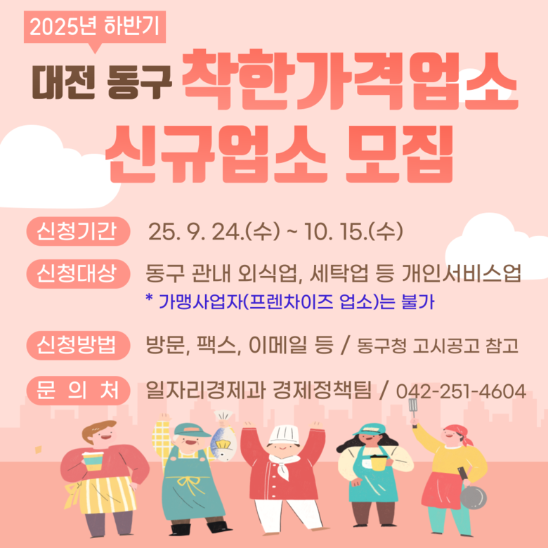 한편, ‘착한가격업소’ 관련 자세한 사항은 동구청 누리집을 통해 확인하거나 동구청 일자리경제과(☎042-251-4604)로 문의하면 된다.