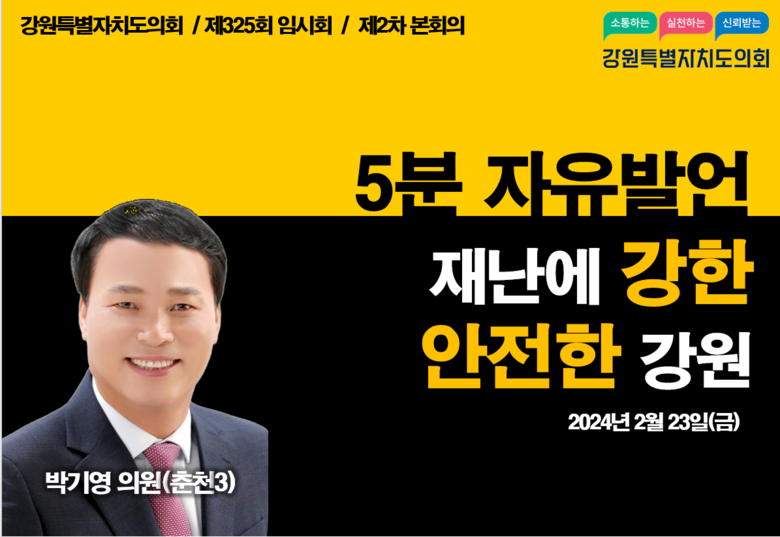 [강원도 세계타임즈=김민석 기자] 강원특별자치도의회 박기영 안전건설위원장(춘천3,국민의힘)은 24년 첫 임시회인 제325회 2차 본회의에서 “재난에 강한 안전한 강원”이라는 주제로 ‘5분자유발언’에 나서 강원형 재난의 대표적 유형인 산불에 대한 강원형 재난대응체계로서「강원산불방지대책본부」를 상설 조직으로 설치할 것을 주장할 계획이다.