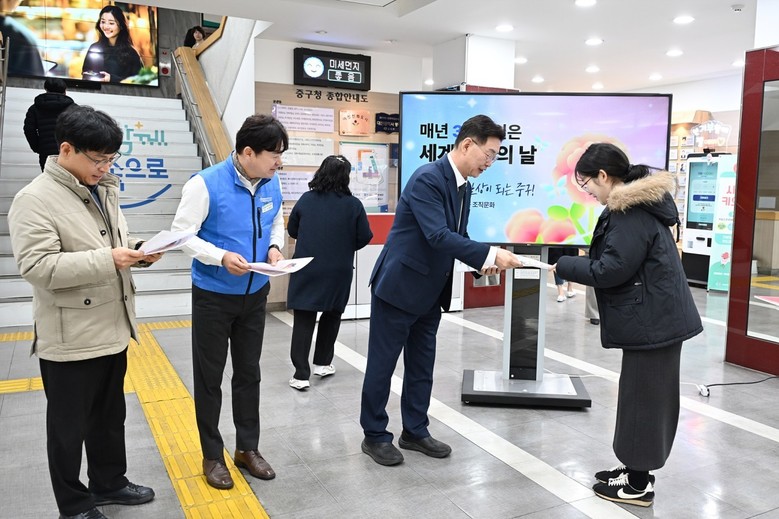 이날 행사에는 김제선 중구청장을 비롯해 이정만 공무원노동조합 위원장, 유우준 공무직노동조합 위원장이 나란히 참여했다. 이들은 출근하는 직원들과 일일이 따뜻한 아침 인사를 나누며, 서로 존중하는 일터 만들기에 동참해 줄 것을 독려해 활기찬 아침 분위기를 조성했다.