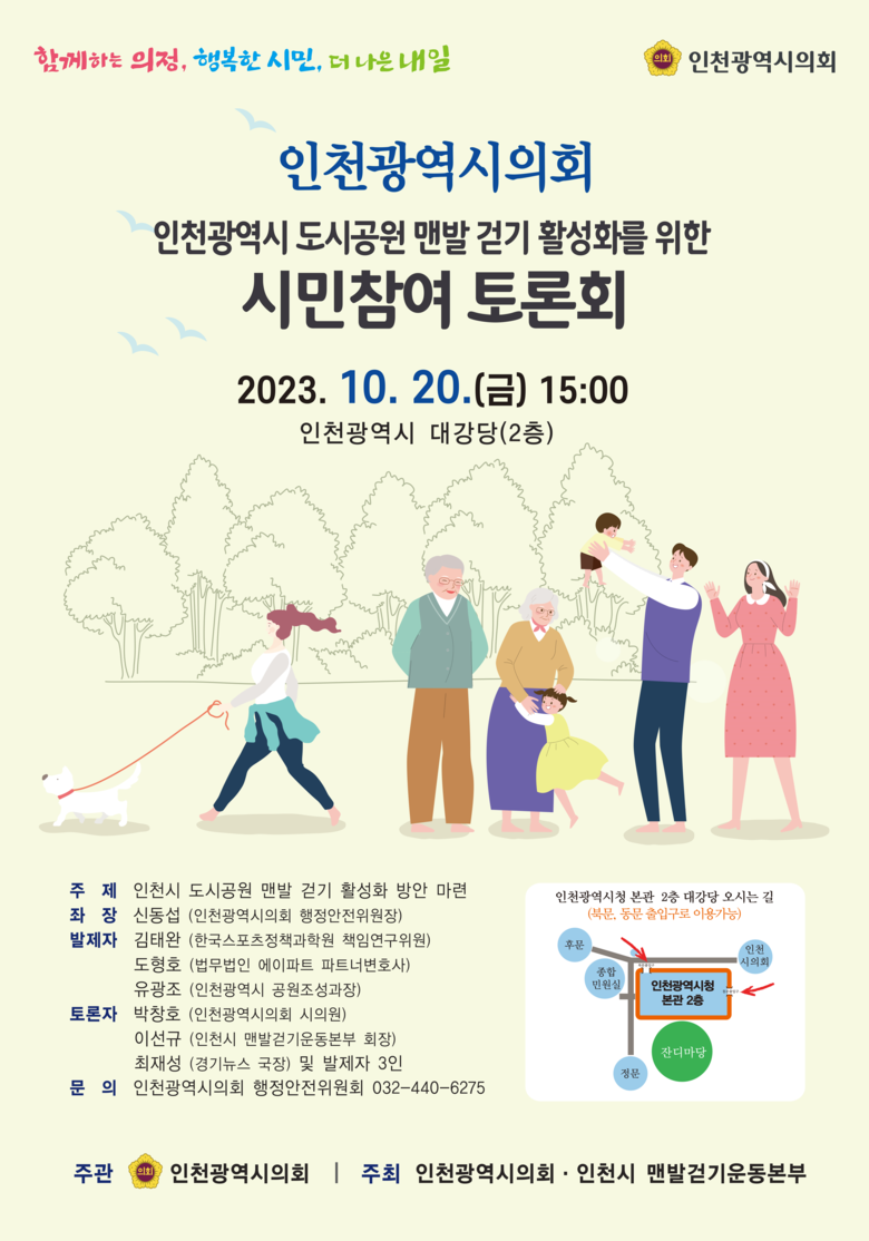 인천광역시의회, 시민참여 토론회 개최를 통해 구체적 사업 점검 [인천 세계타임즈=심하린 기자] 인천광역시의회는 오는 20일 인천시청 대회의실에서 ‘인천시 도시공원 맨발 걷기 활성화를 위한 시민참여 토론회’를 개최한다고 17일 밝혔다.