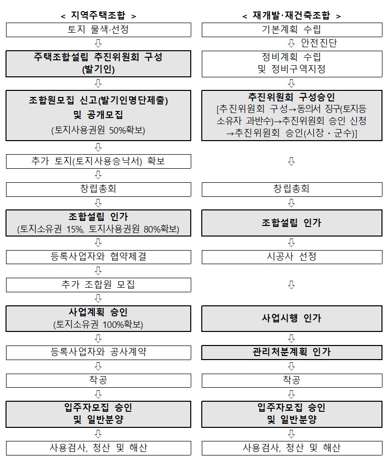<지주택 사업 단계별 절차와 재개발‧재건축 사업과 비교>