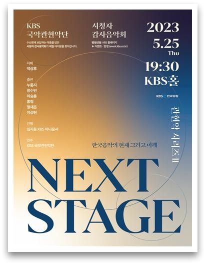 KBS 국악관현악단의 신인예술가 협업 프로젝트 Next Stage는 2022년 KBS국악대경연 수상자를 중심으로 만들어진 공연이다. 성악과 기악 분야에서 우수한 기량을 보여주며 입상한 2명의 소리꾼과 2인의 연주자 그리고 창작단체 분야에서 입상한 2개의 팀이 KBS국악관현악단과 함께 무대를 선보일 예정이다.