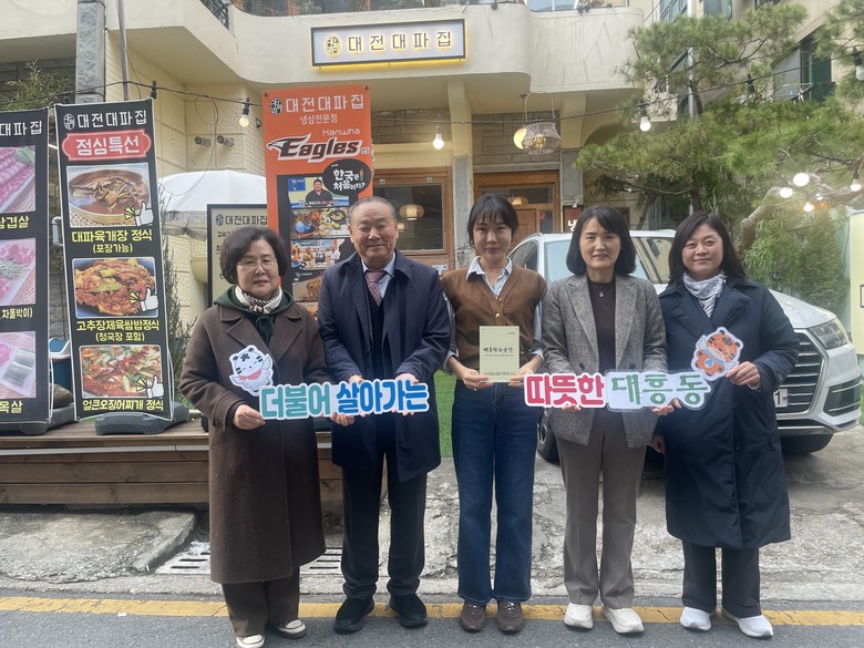 [중구 세계타임즈=이채봉 기자] 대전 중구 대흥동(동장 민순희)은 지난 6일, 지역 내 어려운 이웃을 위해 사회복지기금 정기 후원을 신청한 가게를 방문하여 『대흥착한곳간』액자를 전달했다고 밝혔다.