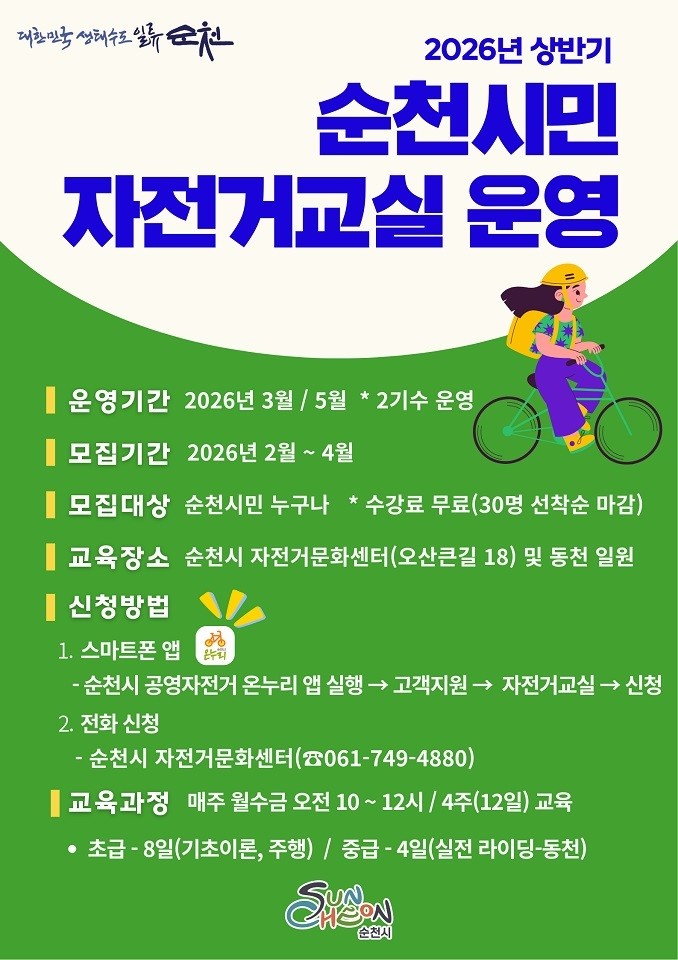 신청 대상은 순천시민 누구나 가능하며, 수강료는 무료다. 신청은 자전거 교실 운영 전 ‘순천시 공영자전거 온누리 앱’을 통해 가능하고, 자전거문화센터 방문 및 전화 접수도 병행한다. 자세한 사항은 순천시 자전거문화센터(061-749-4880)로 문의하면 된다.