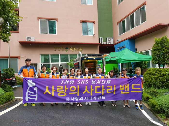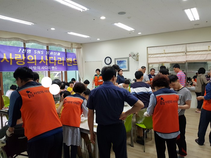 [대전=세계타임즈 이장성 기자] 7천명 SNS 대전시 봉사단체 사랑의 사다리 밴드(리더 이정제)는 27일 오전10시 중구 어남동에 위치한 중증장애인거주시설 우리사랑(원장 조해연)과 서구 복수동에 위치한 중증장애인직업재활시설 도토리보호작업장(원장 장영애)에서 바비큐통닭봉사로 중증장애인들에게 우리 사회의 따뜻한 사랑을 전달하였다.