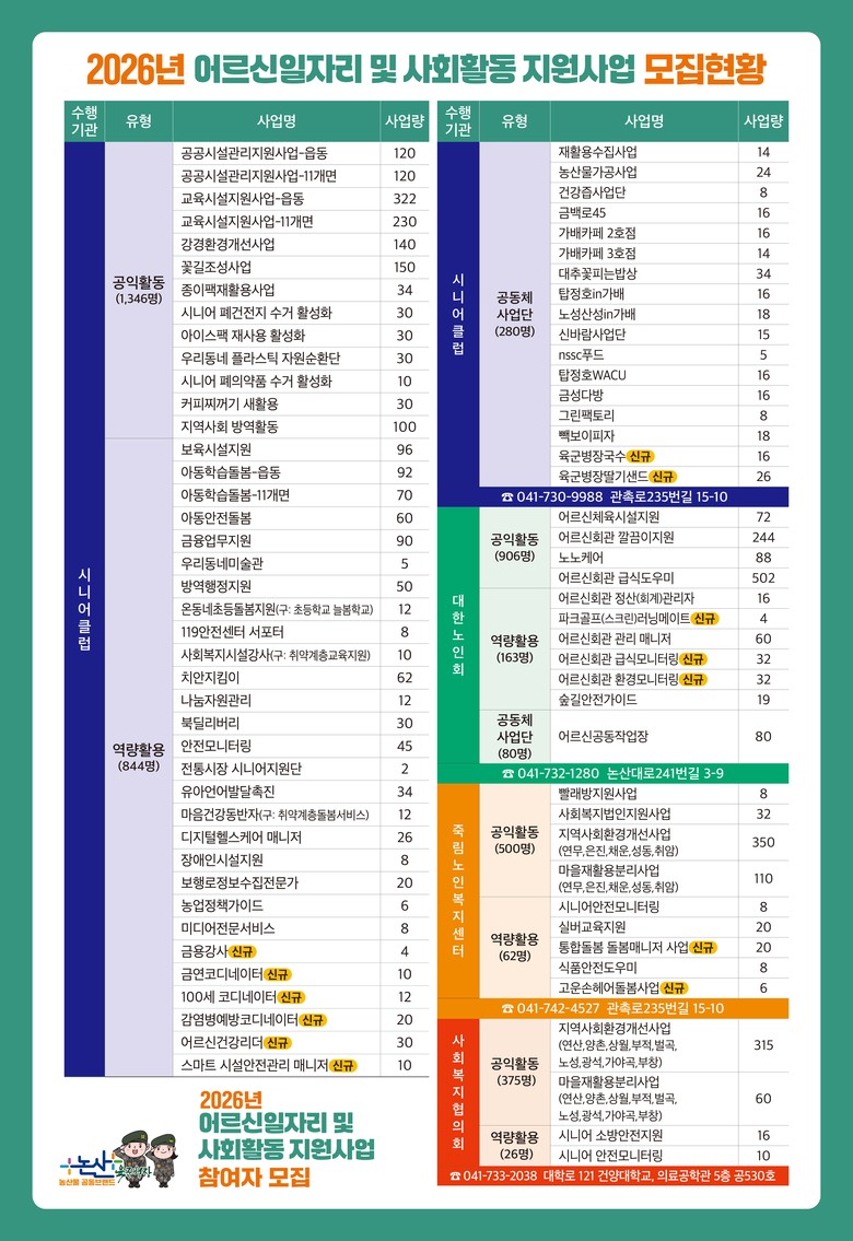 2026년 모집 인원은 올해보다 304명 늘어난 4,582명으로 △지역사회 환경개선사업 등 공익형 3,127명 △보육시설 지원 등 역량활용형 1,095명 △공동체사업단 360명으로 구성된다.
