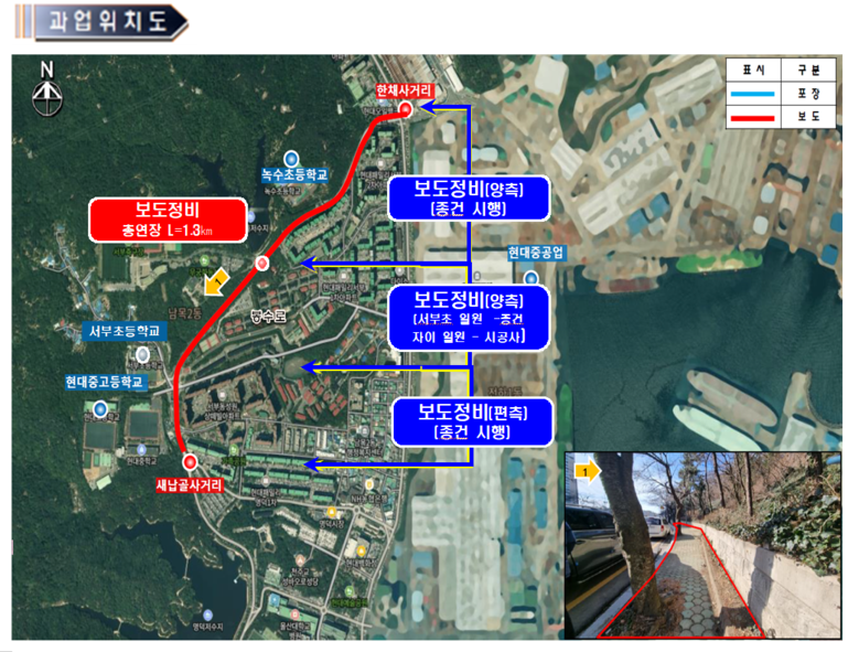 공사구간은 한채사거리에서 새납골삼거리 구간으로 녹수초등학교 및 서부초등학교 학생들이 주로 이용하는 통학로이다.