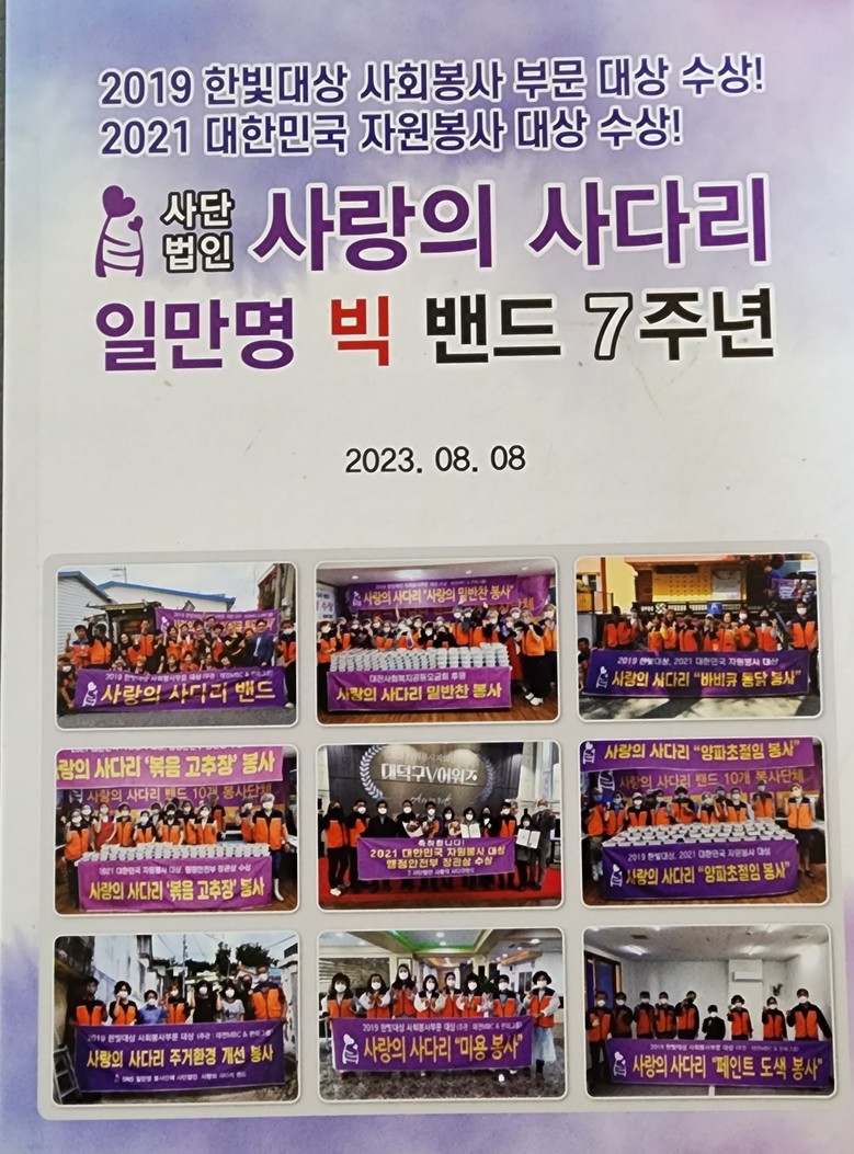 [대전 세계타임즈=이채봉 기자] 1만 명 회원이 가입돼 있는 봉사단체 사랑의 사다리 밴드(리더 이정제)가 8월 8일로 창립 7주년을 맞았다.