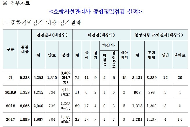 또한 화재 발생시 인명피해가 우려되는 공동주택(아파트) 불량률은 3년 평균 95%, 복합건축물은 77%에 달해 안전관리가 미흡한 것으로 나타났다.
