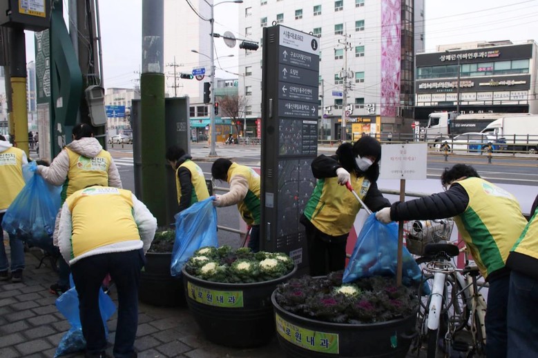 | ▲ 동작지부 봉사자들이 지난 10일 동작구 신대방동 일대에서 거리 청소 봉사를 하고 있다. [사진 제공 = 신천지자원봉사단 동작지부] |