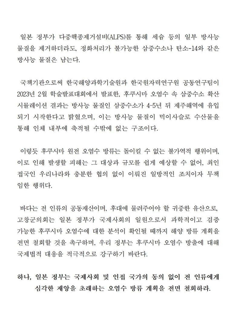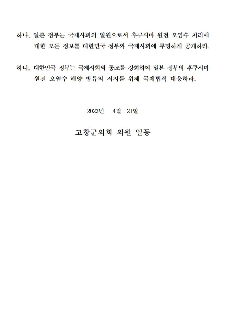 고창군의회는 이번 성명서를 통해서 △일본 정부는 국제사회 및 인접 국가의 동의 없는 오염수 방류 계획 전면 철회할 것, △일본 정부는 국제사회의 일원으로서 후쿠시마 원전 오염수 처리에 대한 모든 정보를 대한민국 정부와 국제사회에 투명하게 공개할 것, △대한민국 정부는 국제사회와 공조를 강화하여 일본 정부의 후쿠시마 원전 오염수 해양 방류 저지를 위해 국제법적 대응에 나설 것 등을 촉구했다.