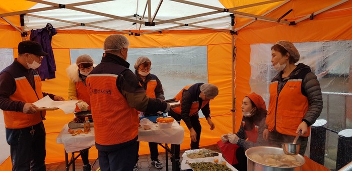 이날 삼계탕봉사는 유희자 단장을 비롯해서 회원 15명이 춥고 비오는 날씨에도 텐트와 주방비품을 준비해서 삼계탕 닭죽 묵무침 부침개로 장대동 50명의 어르신들에게 점심식사를 대접하였다.