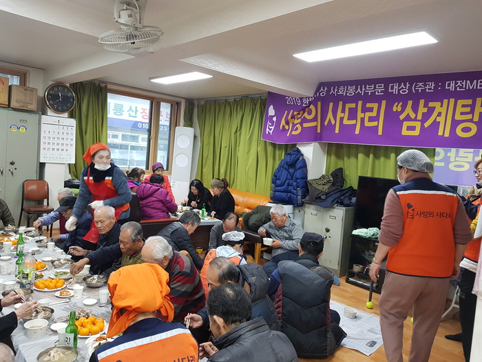 [대전=세계타임즈 이채봉 기자] 대전시 SNS 8천명 봉사단체 사랑의 사다리 밴드(리더 이정제)는 7일 오전10시, 유성구 장대동 장대노인회관에서 삼계탕 봉사로 사회적 효행을 실천 하였다.