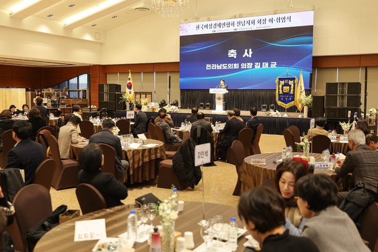 [전남 세계타임즈=우덕현 기자] 김태균 전라남도의회 의장은 2월 21일 오후 4시 남악스카이웨딩컨벤션에서 열린 ‘한국여성경제인협회 전남지회 대표 이‧취임식’에 참석해 취임 축하와 함께 “여성경제인이 40%에 육박하여 미래세대는 여성기업인들 손에 달려있다”며 격려했다.