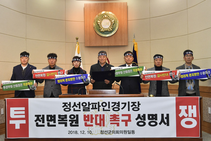 [정선군=세계타임즈 김민석 기자] 정선군의회(의장 유재철)에서는 12월 10일 의회 본회의장에서 환경부와 산림청에서 주장하고 있는 정선 알파인경기장 완전복원에 대하여 강력하게 반대하는 성명서를 발표했다.