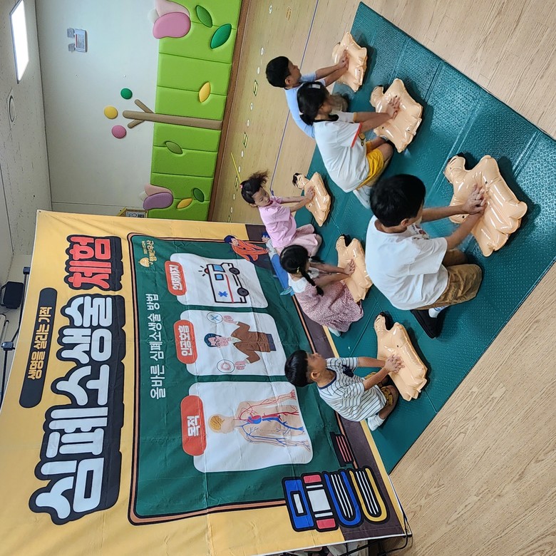 응급처치 교육은, 어떠한 상처에 무슨 처치를 하여야 하는지 설명 후 다친 친구를 낫게 해주는 방법에 대해 체험을 통하여 몸과 눈으로 익혔고, 하임리히 요법 교육은, 유아가 음식 뿐 아니라 작은 물건을 삼켰을 때 당황하여 목에 걸린 이물질을 제거하고자 입에 손을 넣고 꺼내려는 상황이 발생하므로 체험용 마네킹 배를 눌러 이물질을 빠져 나오게 하여 기도를 확보하는 요령을 배웠으며, 심폐소생술 교육은, 유아들이 정확히 누르면 소리나는 모형으로 의식 확인-호흡 확인-구조요청-가슴압박 등 올바른 순서와 자세를 배우는 체험으로 진행되었다.