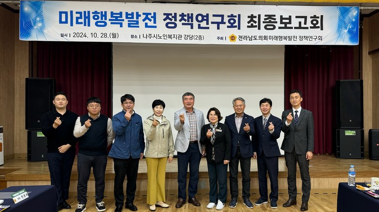 [전남 세계타임즈=우덕현 기자] 전라남도의회 ‘미래행복발전 정책연구회(대표의원 송형곤)는 지난 10월 28일 나주시 일원에서 「노인복지 및 청년과 지역공동체 상생」을 주제로 정책연구용역 최종보고회를 개최했다.