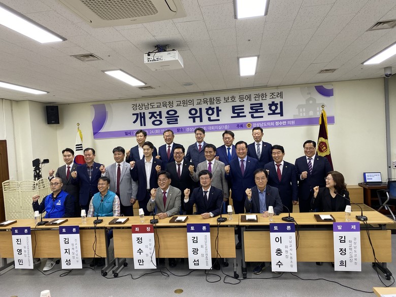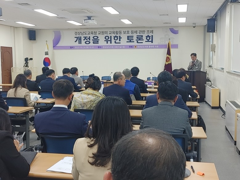 [경남 세계타임즈=최성룡 기자] 경상남도의회 교육위원회 정수만(거제1‧국민의힘) 의원은 24일 도의회 대회의실에서「경상남도교육청 교원의 교육활동 보호 등에 관한 조례」전부 개정안을 발의를 논의하기 위한 토론회를 개최하였다.
