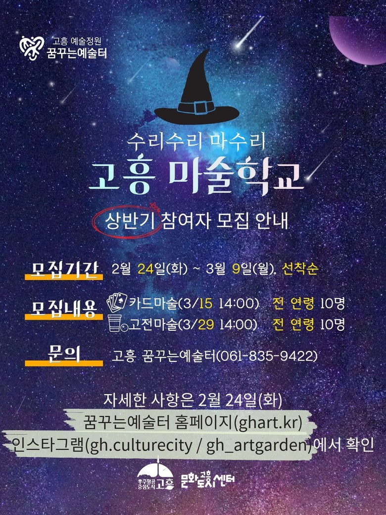 고흥군 문화도시센터 권지애 센터장은 “마술은 생애주기별 발달 과정에서 중요한 창의력과 집중력 향상, 자신감 형성에 도움을 주는 예술 장르”라며 “누군가에게 작은 놀라움을 선물할 수 있는 마술의 매력을 직접 경험해 보시기를 바란다”고 말했다.