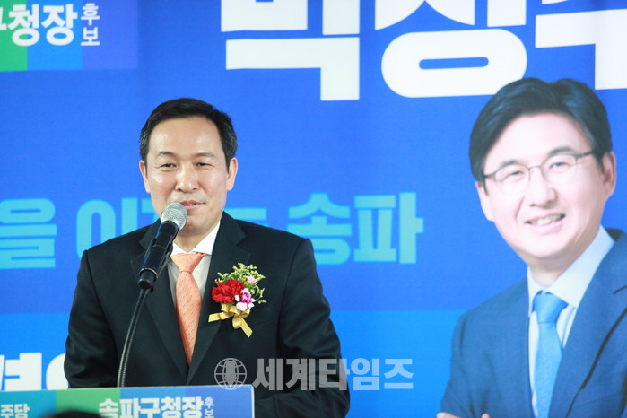 더불어민주당 우상호의원이 박성수 송파구청장 예비후후개소식 참석 축하 하고 있다.사진=이연종 기자