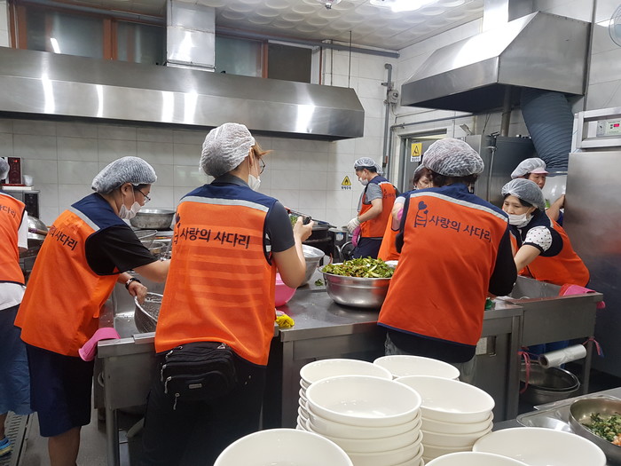 윤성은 행복마을 원장은 “비오는 날씨에도 사랑의 사다리 밴드 봉사단체에서 삼계탕을 지원해주셔서 큰 힘과 위안이 된다.”면서 감사함을 전했다.