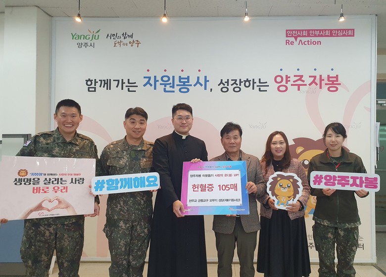 [양주시 세계타임즈=송민수 기자] 양주시자원봉사센터(센터장 이정주)는 천주교 군종교구 오뚜기 성당(제8기동사단) 오형훈 군종신부와 군 장병들이 연말을 맞아 헌혈증 105장을 기부했다고 밝혔다.