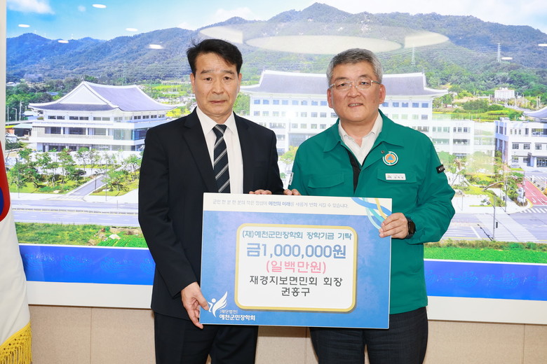[예천군 세계타임즈=한윤석 기자] 재경지보면민회 권홍구 회장(㈜친화건설 대표)이 28일 오후 3시, 예천군청을 방문해 (재)예천군민장학회(이사장 김학동 예천군수)에 장학금 1백만 원을 기탁했다.