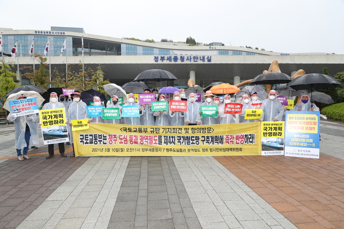 박문희 충청북도의회 의장은 10일 국토교통부 세종청사에서 최충진 청주시의회 의장, 이두영.유철웅 비대위 대표, 시민단체와 함께 청주도심 통과 충청권 광역철도망 구축계획 반영을 촉구하는 기자회견을 가졌다.