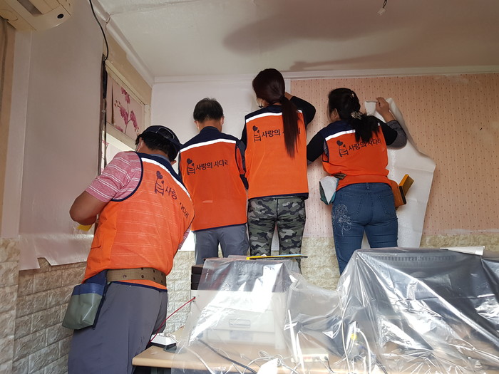 [대전=세계타임즈 이채봉 기자] 9천명 SNS 대전시 봉사단체 사랑의 사다리 밴드(리더 이정제)는 7일 오전10시, 동구 가양1동 수해가정의 도배봉사로 우리 사회의 따뜻한 사랑을 전달하였다.