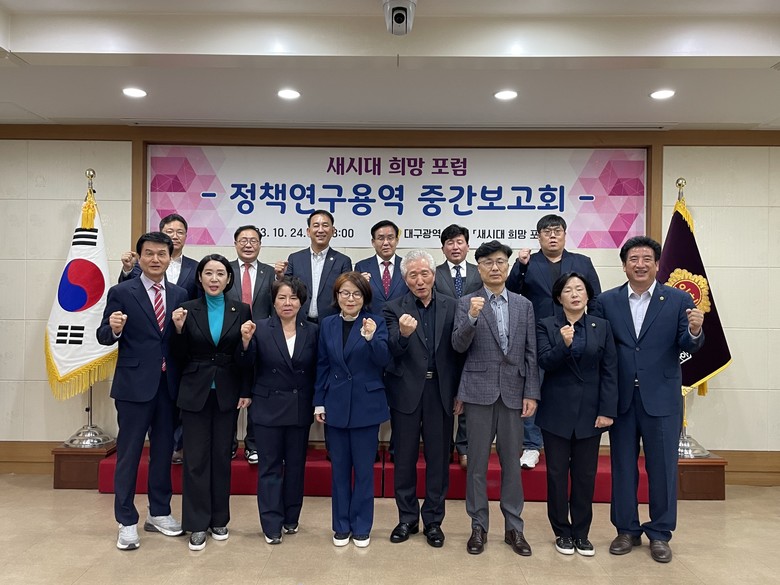 [대구 세계타임즈=한성국 기자] 대구시의회 의원연구단체 ‘새시대 희망 포럼(이하 ‘포럼’)‘(대표 황순자 의원)은 10월 24일(화) 오후 2시 의회 3층 회의실에서 소속단체 의원(대표 황순자, 간사 이성오, 김대현, 전태선, 박우근, 이재숙, 하중환, 정일균, 김재용, 윤권근, 김정옥, 박소영, 박창석, 육정미)이 참석한 가운데 ‘대구시 청년 일자리·주거정책 평가 및 개선방향 연구’ 용역 중간보고회를 개최했다.