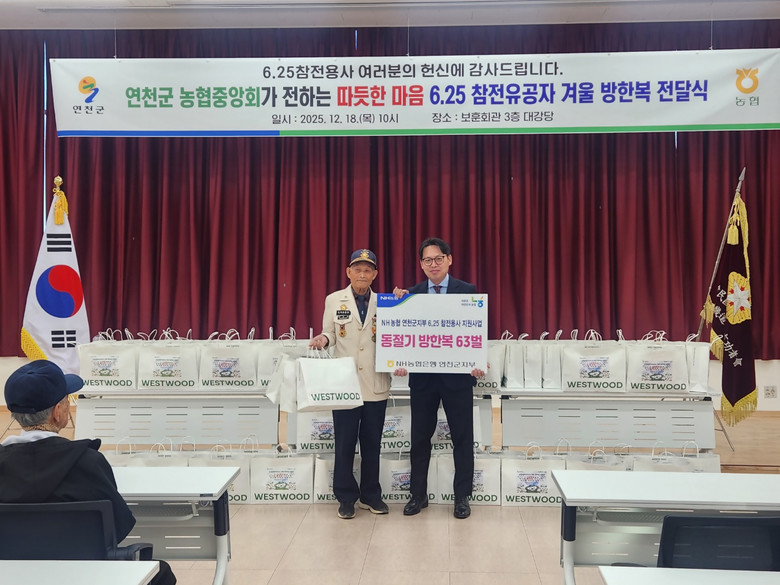 [연천군 세계타임즈=송민수 기자] NH농협 연천군지부(지부장 한창기)는 18일 연천군 보훈회관에서 연천 관내 6.25 참전유공자에 감사와 사랑의 마음을 담은 600만원 상당의 위문품(동절기 방한복)을 전달했다.