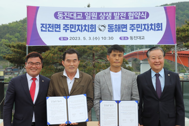 [경남 세계타임즈=최성룡 기자] 경남도의회 경제환경위원회 강용범 부의장(국민의 힘, 창원8), 허동원 의원(국민의 힘, 고성2)은 3일 「동진대교 일원 발전을 위한 진전.동해면 주민자치회 상생 협약식」에 참석해 동진대교 경관조명 설치사업 등 ‘관광명소화’ 사업에 경남도가 정책적 관심을 기울일 것을 촉구했다.