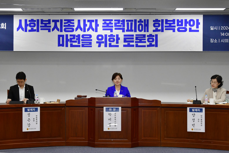 [광주 세계타임즈=손권일 기자] 광주광역시의회 박미정(더불어민주당,동구2) 의원은 24일 광주시의회 예산결산특별위원실에서 ‘사회복지종사자 폭력피해 회복방안 마련을 위한 정책토론회’를 성황리에 개최했다.