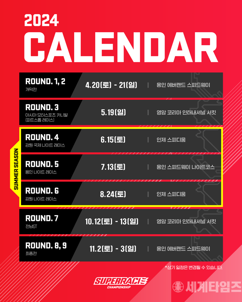 [세계타임즈=방춘재 기자] 2024 슈퍼레이스 챔피언십 일정이 발표됐다. 2024년 슈퍼레이스는 4월 20일 용인 에버랜드 스피드웨이에서 개막해, 11월 3일 용인으로 다시 돌아와 시즌 챔피언을 가린다.