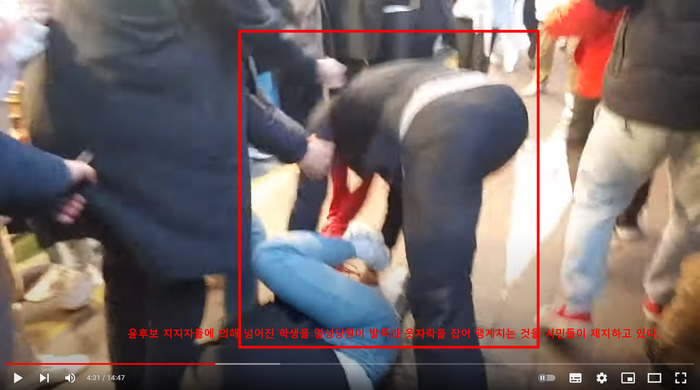 그 현장에서 윤후보를 지지하는 빨간 목도리의 당원들 및 검은 마스크의 사람으로부터 밀쳐지고 , 목이 조이고 넘어진 학생을 다시 들어 던지는 등의 폭력 적인 선거유세장이 시민들에게 보여졌다.