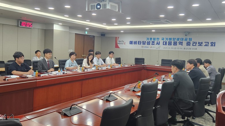 도는 29일 도청 중회의실에서 전상욱 도 해양수산국장과 서산시·태안군, 한국해양수산개발원, 국토연구원, 해양환경공단 등 관계자 20여 명이 참석한 가운데 ‘가로림만 국가해양생태공원 예타 대응 용역 중간보고회’를 개최했다고 밝혔다.