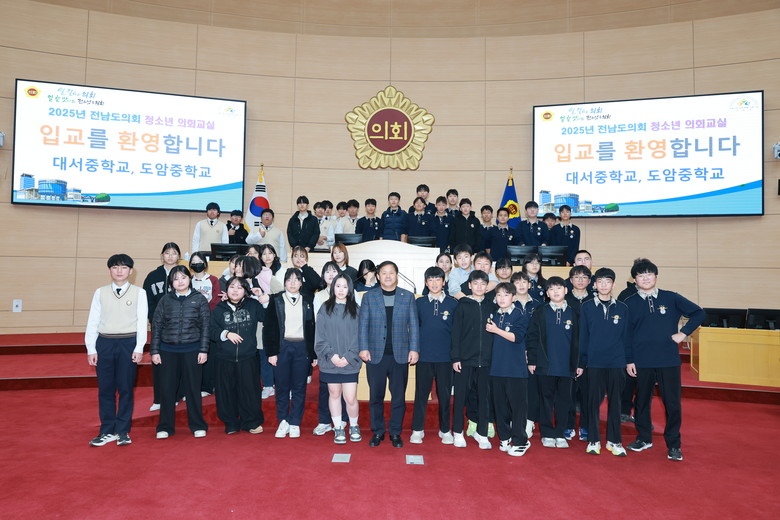 이날 청소년 의회교실에는 고흥 대서중학교 27명, 강진 도암중학교 25명 등 총 52명의 학생이 참여해 △입교식 △도의원과의 대화 △본회의 안건 처리(조례안 찬반토론) △3분 자유발언 △퀴즈교실 △수료식 순으로 진행됐다. 학생들은 본회의장 의원석에 앉아 의장선출, 집회보고, 표결 절차 등을 직접 체험하며 ‘1일 도의원’으로서 지방의회 운영 과정을 생생하게 익혔다.