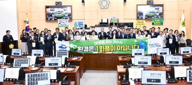 여수시의회(의장 김영규)는 지난 4월 29일 여수시의회 전체 의원과 의회사무국 직원 등 40여 명이 참여한 가운데 환경 오염 및 자원 낭비를 예방하기 위한 ‘일회용품 없는 공공청사 만들기’ 캠페인을 실시했다.