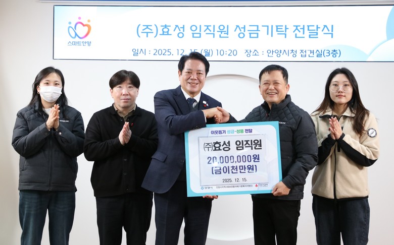 최대호 안양시장은 “어려운 경제 여건 속에서도 따뜻한 나눔을 실천해 주신 ㈜효성 임직원 여러분께 깊이 감사드리고 꼭 필요한 저소득가정을 위해 의미 있게 사용하겠다”고 밝혔다.