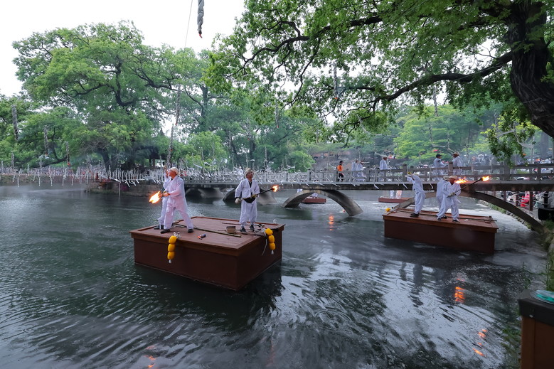 이번 함안 낙화놀이 행사는 당일 저녁 비 예보에 따라 예정보다 1시간 가량 앞당겨 진행됐다. 인사말과 축사에 이어 오후 6시경 점화가 시작됐다. 연못에서 뗏목을 타고 낙화봉 하나하나에 불을 붙이면 바람의 강약에 따라 떨어지는 불꽃이 장관을 이뤘다.