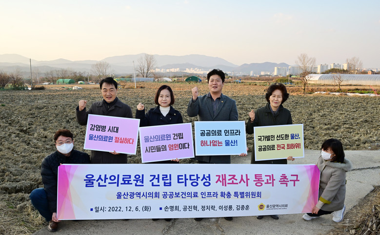 울주군 범서읍 산재전문공공병원 부지와 북구 창평동 울산의료원 부지를 찾아 추진상황을 점검, 울산의료원 타당성 재조사 통과와 건립 촉구를 위한 110만 시민들의 염원을 알리기 위해 손피켓 퍼포먼스도 실시했다.
