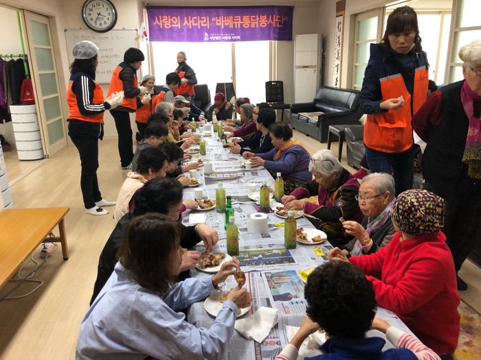 이날 통닭봉사는 노은3지구1단지, 노은 4단지, 반석마을 4,8단지 등 4곳의 경로당에 자원봉사자들이 직접 방문하여 전달을 하였다.