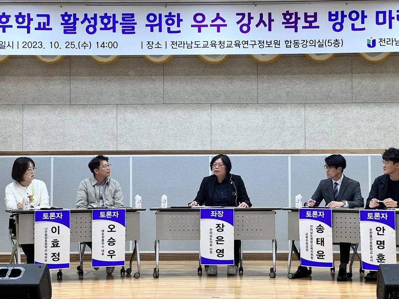 [전남 세계타임즈=우덕현 기자] 전라남도의회 교육위원회 소속 장은영 의원(더불어민주당)은 지난 10월 25일(수) 전라남도교육청교육연구정보원에서 ‘방과후학교 활성화를 위한 우수 강사 확보 방안 공청회’를 통해 전남교육의 질 제고를 강조했다.