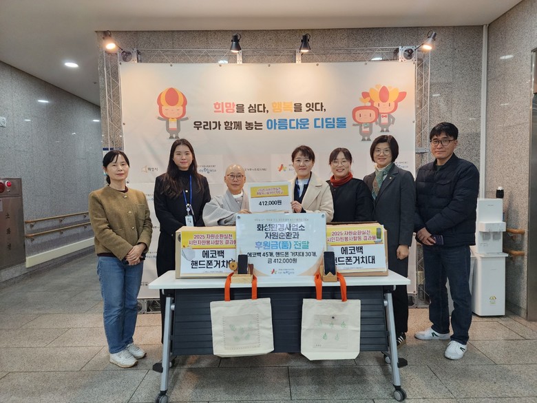 [화성시 세계타임즈=송민수 기자] 화성특례시(시장 정명근)가 지난 16일 화성시아르딤복지관에 2025년 자원순환실천 시민봉사활동으로 마련된 에코백·핸드폰거치대와 재활용나눔장터 활동으로 마련된 기부금 40만 원을 전달했다.