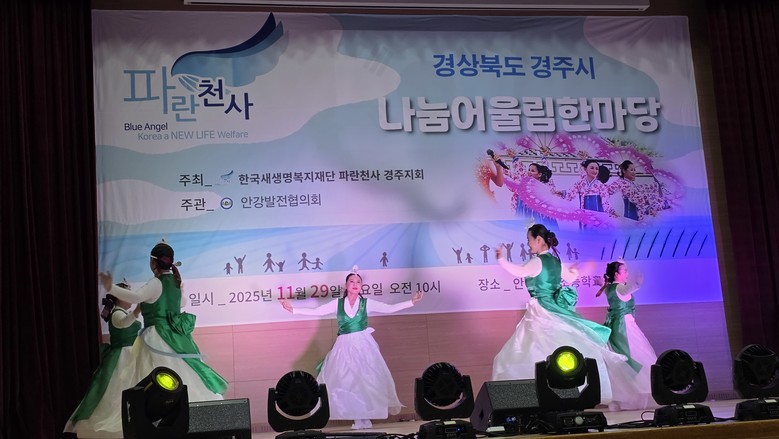 [세계타임즈]최성룡기자 = 2025년 11월 29일 토요일, 경주시지회가 주최한 ‘나눔어울림한마당’ 행사가 안강제일초등학교 강당에서 따뜻하게 열렸다. 이번 행사는 지역 어르신들에게 문화와 휴식을 제공하기 위해 마련된 뜻깊은 자리였으며, 파란천사의 나눔 정신이 현장에서 아름답게 실천된 하루였다.