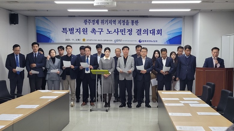 2일(목) 광주광역시의회 1층 시민소통실에서 열린 ‘광주경제 위기지역 지정을 통한 특별지원 촉구 노사민정 결의대회’에서는 대유위니아그룹 계열사 경영 위기로 촉발된 고용위기 해결을 위해 ‘고용위기지역 지정’과 협력업체의 체계적인 지원을 위한 ‘중소기업 특별지원지역’ 및 ‘산업위기대응특별지역’ 지정을 호소했다.
